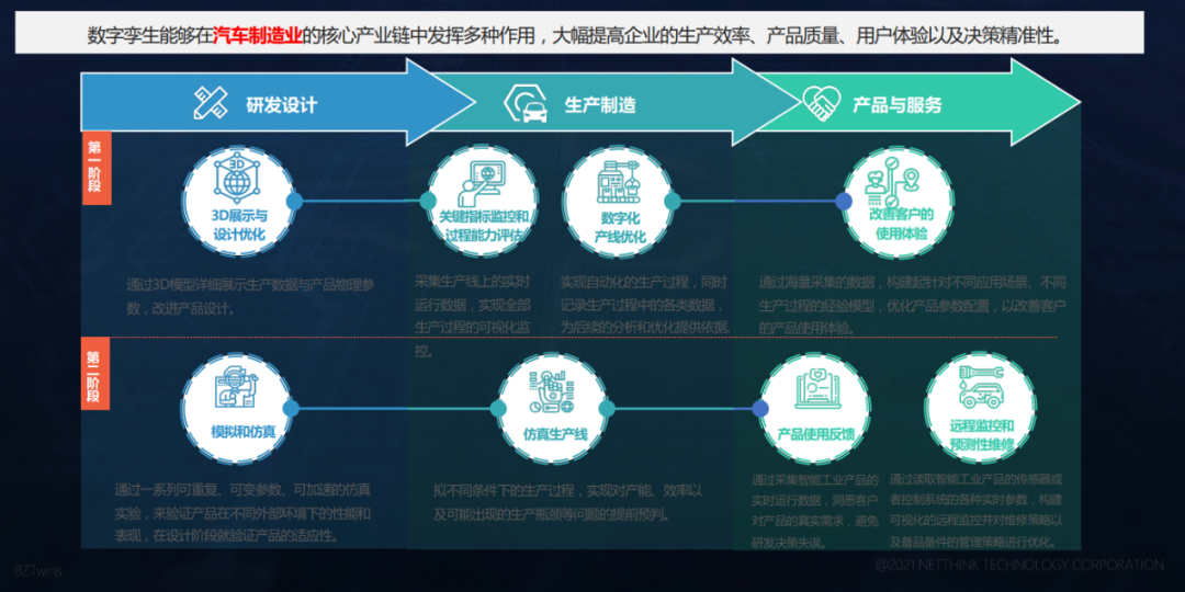 与仿真、工业互联网等其他数字化技术相比,数字孪生可以在产品研发、生产制造、设备运维、营销售后的全链条发挥重要作用。